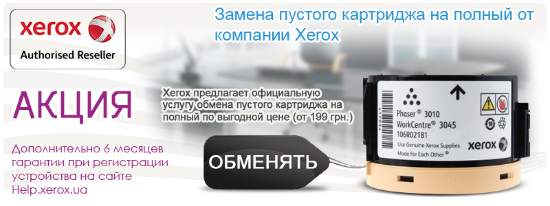можете смело заходить на сайт www.help.xerox.ua или звонить на телефон 0-800-50-55-64, всего в несколько кликов Вы можете заказать обмен пустого картриджа на полный. При этом Xerox гарантирует: