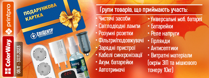 Купуйте товари ТМ ColorWay та TM PrintPro на суму від 300$ та отримуйте сертифікат Епіцентру у подарунок!