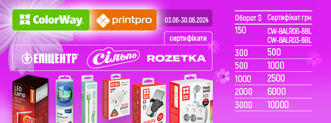 При купівлі товарів ТМ ColorWay та TM PrintPro сертифікат Епіцентр, Розетка або Сільпо у подарунок!