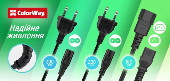 Кабель живлення ColorWay C7 - компактне рішення для підключення техніки з двоконтактним роз'ємом C7 (IEC 60320) до електромережі. Ідеально підходить для ноутбуків, ігрових приставок, зарядних станцій, аудіо- та відеотехніки, а також інших пристроїв, що не потребують заземлення.