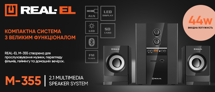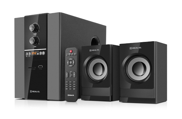 REAL-EL M-355 має LED-дисплей, зручну панель керування і кріплення для настінного розміщення сателітів. Дерев'яний корпус сабвуфера і сателітів не лише додає стилю, а й покращує акустичні властивості. REAL-EL M-355 - це збалансована акустика з широким функціоналом, яка вдало поєднує потужність, універсальність і комфорт.