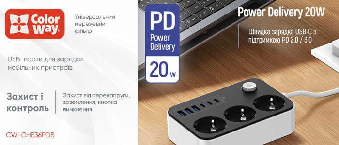 Універсальний мережевий фільтр з USB-портами для зарядки мобільних пристроїв - СolorWay CW-CHE36PDB