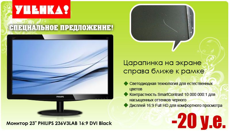 Внимание! Уценен товар монитор 23'' Philips 236V3LAB/00. Отличное качество яркого LED-изображения.